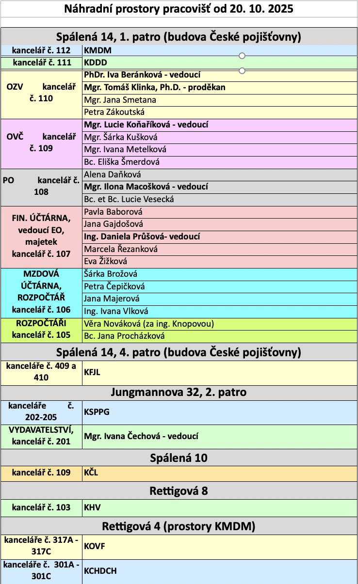 V souvislosti s rekonstrukcí budovy dochází k dočasnému přesunu vybraných pracovišť. Níže najdete přehled jejich nových umístění. Při plánování návštěvy prosím věnujte pozornost aktualizovaným adresám.